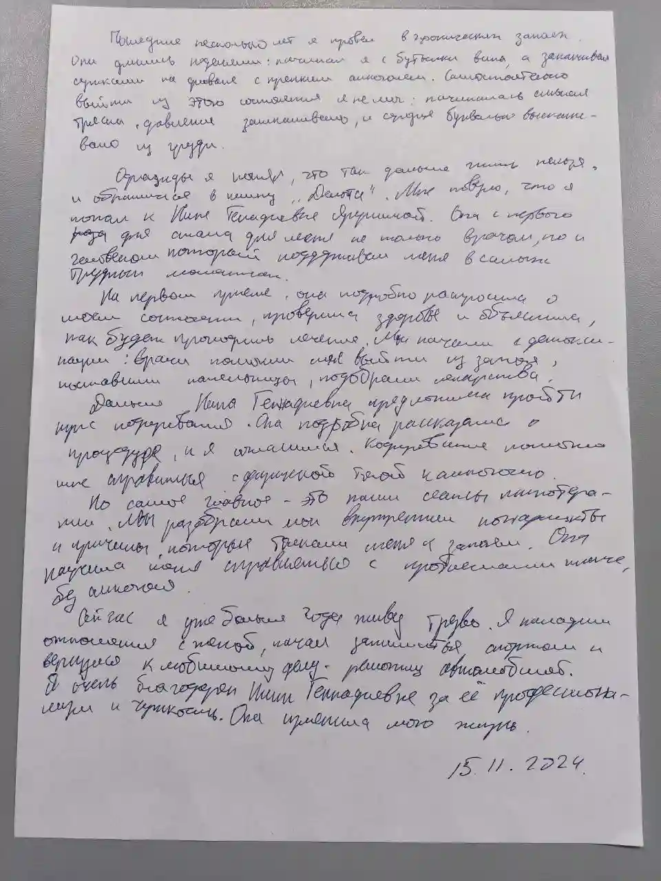В клинике "Дельта" работают только квалифицированные наркологи и психотерапевты, которые используют самые современные методы лечения и профилактики зависимостей. Мы понимаем, что лечение зависимости — это не только физическое восстановление, но и психологическая поддержка. Поэтому каждый пациент получает комплексную помощь, которая включает не только кодирование, но и дополнительные консультации с психологами и наркологами. Мы проводим кодирование Вивитролом в условиях частной клиники, что позволяет создать атмосферу доверия и комфорта для каждого пациента.